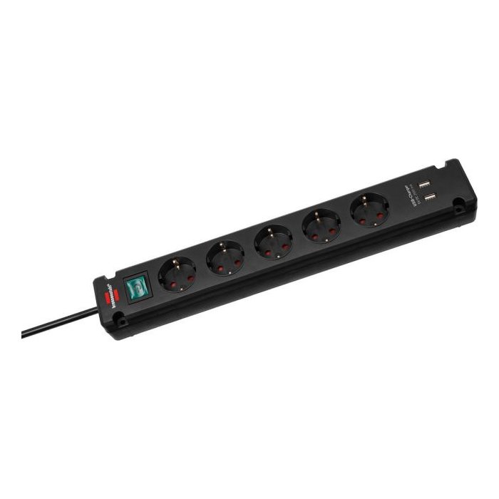 Intended use: multi-socket power strip Connectors: 5 x earthed socket, 90°,2 x USB Type-A jack, 1 x earthed plug Cable specification: H05VV-F3G x 1.5mm2 Length: 3 m Colour: black Internal conductor: 3 x 1.5 mm2 No. of cores: 3 Power rating: 3,500 W Weight: 644 g Special feature: with switch