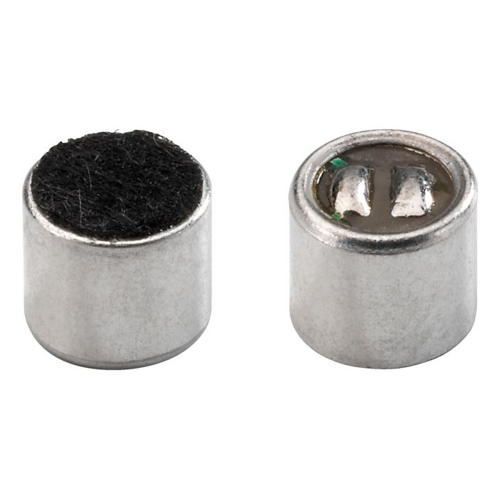 Polar pattern: omnidir. Frequency range: 20-20,000 Hz Sensitivity: 6.3 mV/Pa Max. sound pressure: 115 dB Output impedance: 2.2 kΩ S/N ratio: > 58 dB Admiss. ambient temp.: 0-40 °C Power supply: DC 1-10 V/0.5 mA Dimensions: Ø 6 mm x 5.2 mm Weight: 1 g