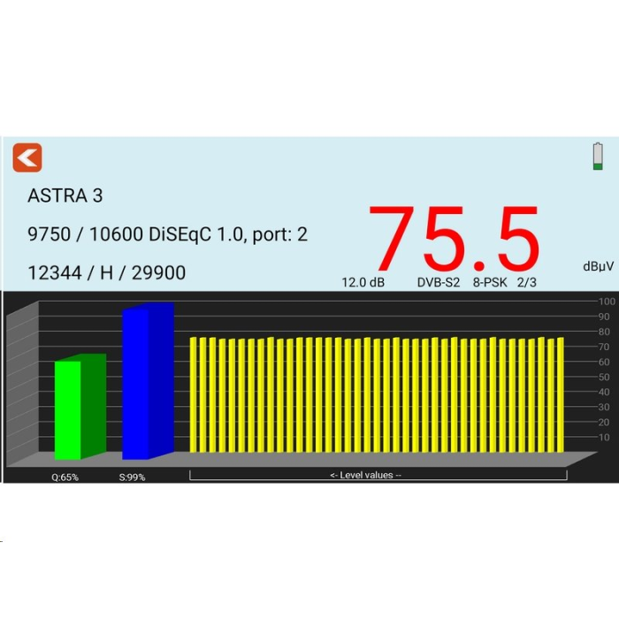 Měření signálu v normách DVB-S/S2/T/T2/C/C2/DAB/DAB+/H.264/H.265. CZ/SK MENU, spektrum, konstelace, NIT (detekce družice), monitoring DiSEqC. Zobrazení obrazu u FTA programů.