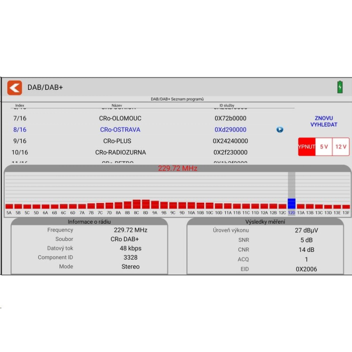 • Měření hodnot dBµV, SNR, CNR, ACQ, EID