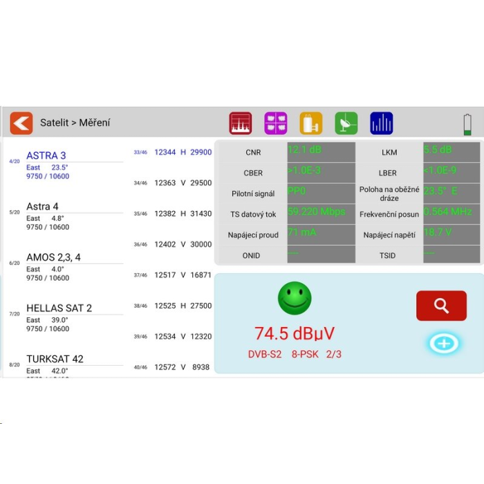 • DVB-S: CNR / LKM / CBER / LBER / PWR úroveň / kvalita dBµV / dBm.