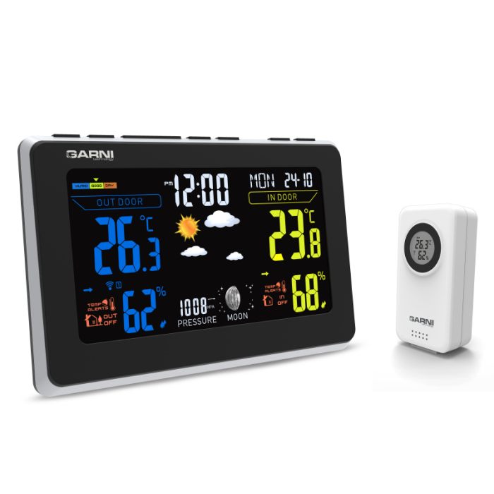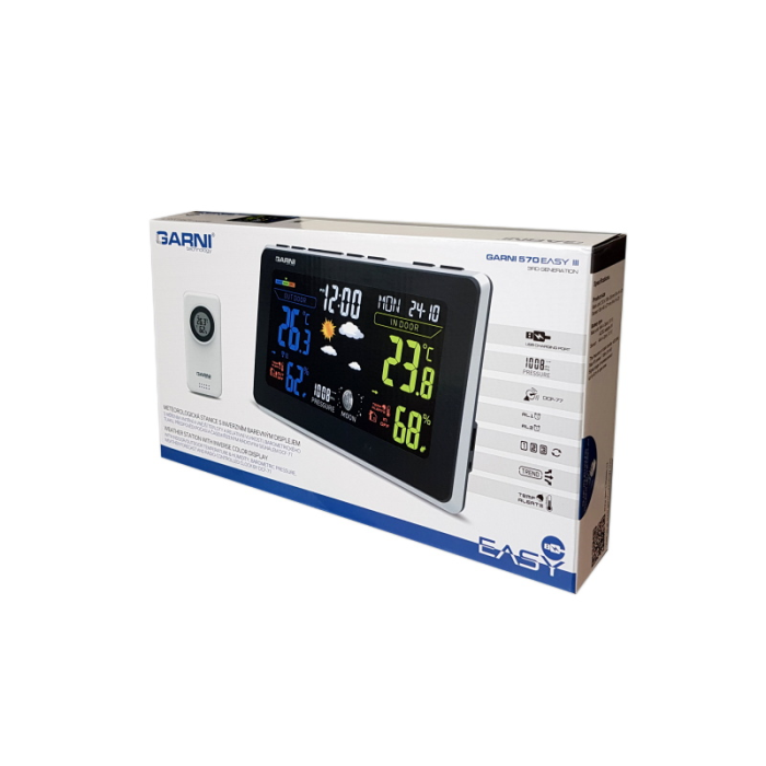 Třetí generace úspěšné meteorologické stanice GARNI 570 EASY se špičkovým inverzním barevným VA displejem s časem řízeným rádiovým signálem DCF-77, budíkem, měřením vnitřní teploty, relativní vlhkosti a absolutního barometrického tlaku, bezdrátovým čidlem pro měření vnější teploty a relativní vlhkosti a USB portem pro napájení externích zařízení.