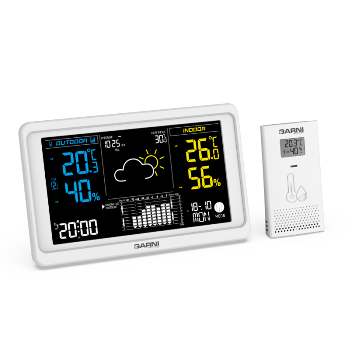 Meteorologická stanice GARNI 618W Precise, VA displej, ukazatel času, datumu, budík, vnitřní/vnější teplota, relativní vlhkost, možnost připojení až 3 čidel GARNI 063H, zobrazení fáze měsíce,možnost napáiení síťovým adaptérem nebo bateriemi.