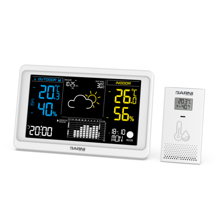 Moderní a přesná meteorologická stanice s inverzním barevným VA displejem s ukazatelem času a datumu, s možností nastavení budíku, měřením vnitřní teploty, relativní vlhkosti, barometrického tlaku a bezdrátovým čidlem pro měření vnější teploty a relativní vlhkosti. Stanice je řízena rádiovým signálem DCF-77. Pro dosažení vysoké přesnosti měření teploty a relativní vlhkosti jsou použita špičková čidla švýcarské značky SENSIRION