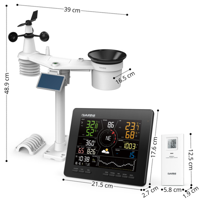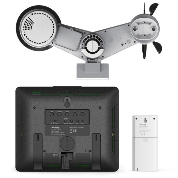 Integrované bezdrátové čidlo 7-v-1 GARNI 1NG měří vnější teplotu a relativní vlhkost, rychlost a směr větru, dešťové srážky, UV index a sluneční záření a data jsou odesílána do hlavní jednotky až do vzdálenosti 150 m (v otevřeném prostoru). Napájení zajišťuje vestavěný kapacitor, který je nabíjen pomocí vestavěného solárního panelu. Baterie slouží jako záložní zdroj. Čidla jsou kompletně smontovaná a kalibrovaná tak, aby pro vás byla instalace co nejjednodušší.