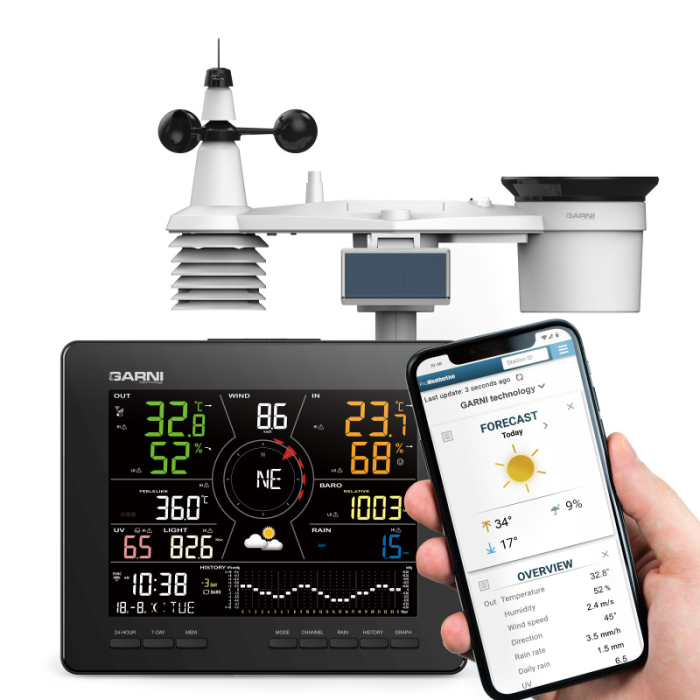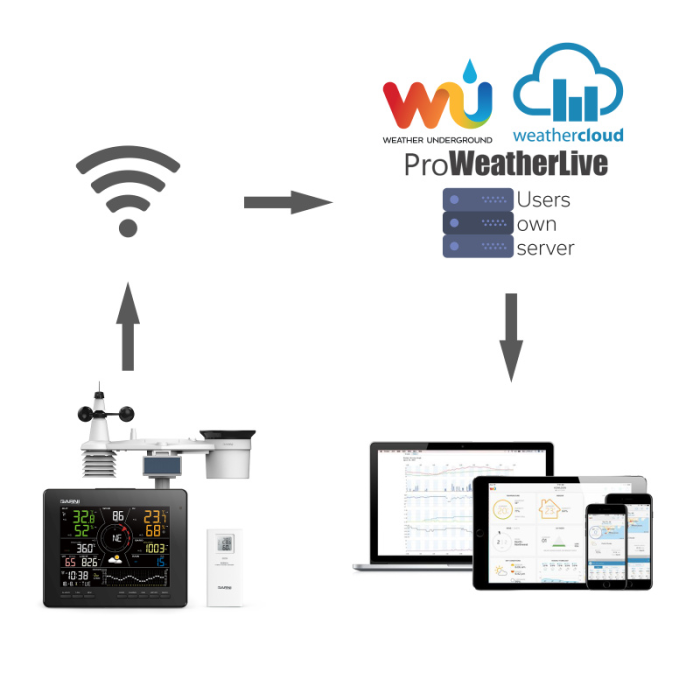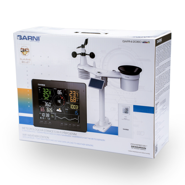 Meteorologická stanice s Wi-Fi, 24hodinovou / 7denní předpovědí a profesionálním integrovaným bezdrátovým čidlem 7-v-1 se solárním panelem a vestavěným kapacitorem, model GARNI 2060 Arcus, shromažďuje přesné a podrobné údaje o počasí, které jsou pak v reálném čase odesílány pomocí vestavěného Wi-Fi modulu a místní sítě Wi-Fi na meteorologické servery a aplikace, jako jsou ProWeatherLive, Weather Underground, Weathercloud,