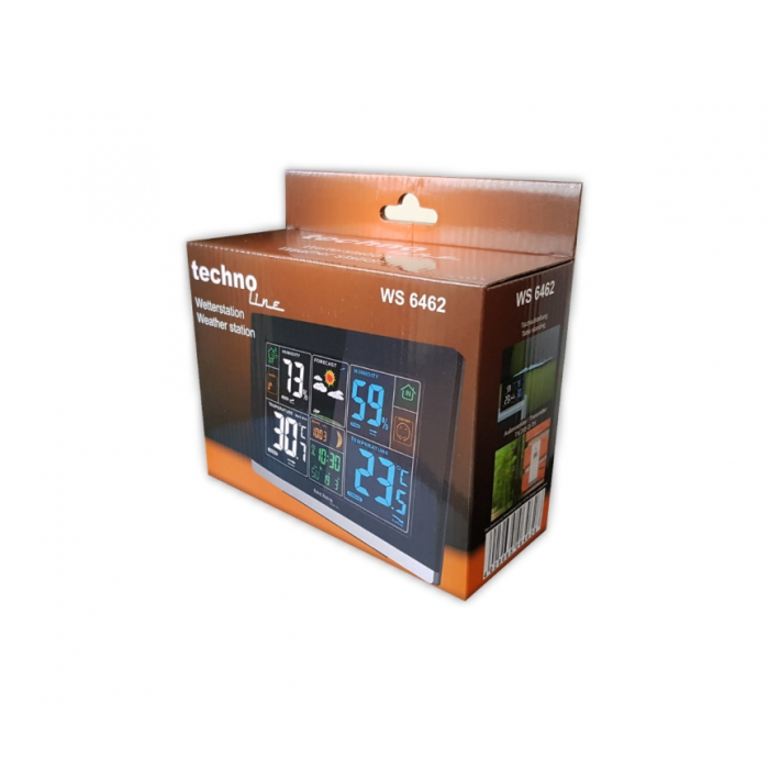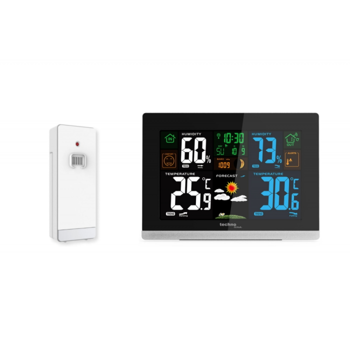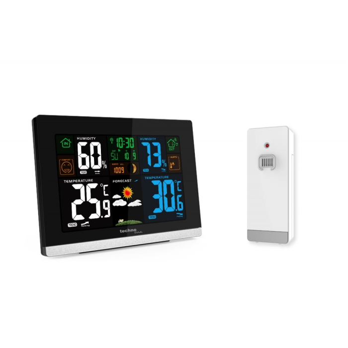 Meteorologická stanice řízený rádiovým signálem DCF-77, s barevným inverzním displejem. Měření vnitřní a vnější teploty a relativní vlhkosti, hodiny, budík, fáze měsíce, indikace námrazy...