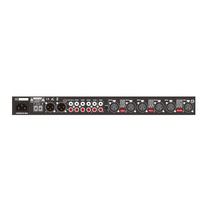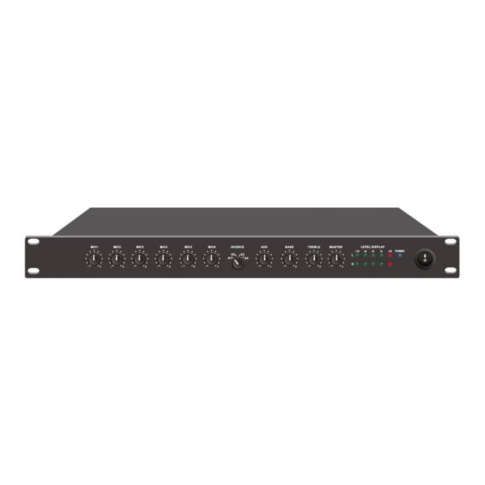 MIX-604 je všestranný mixážny pult alebo stereo predzosilňovač, ktorý je navrhnutý pre verejné ozvučenie a profesionálne audio aplikácie. Stereo mixpult môže napájať 6 vyvážených mikrofónových/linkových vstupov a ďalšie 4 aux vstupy, plus jedno rozhranie so systémom hlasového alarmu. Rôzne vstupné úrovne priority zjednodušujú jednoduchý konferenčný systém, každý mikrofónový vstup podporuje 48V fantómové napájanie. Systém duálneho napájania AC 110V-240V a 24V DC. Ideálne s dvojkanálovým zosilňovačom na nastavenie 2-zónového systému verejného ozvučenia alebo stereo profesionálneho zvukového systému pre mešitu, triedu, zasadaciu miestnosť a hotelový zvukový systém atď.