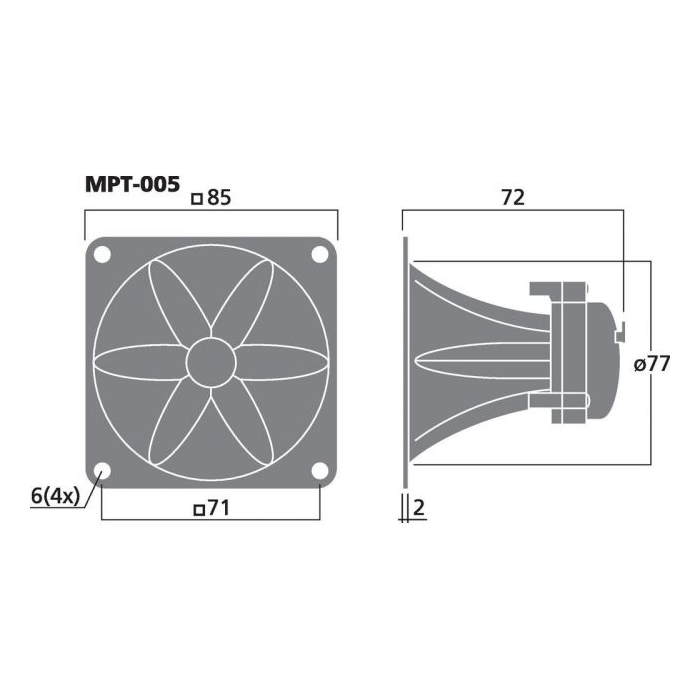 Impedance (Z): > 1,000 Ω Transmission technology: cable Frequency range: 4,000-20,000 Hz Power rating (RMS): 60 W Peak music power output (MAX): 115 W (8 Ω system) 225 W (4 Ω system) SPL: 94 dB/W/m Max. voltage: ~ 30 V Mounting cutout: Ø 77 mm Mounting depth: 72 mm Hole spacing X-axis: 71 mm Hole spacing Y-axis: 71 mm Dimensions: 85 x 85 x 72 mm Width: 85 mm Height: 85 mm Depth: 72 mm Colour: black Admiss. ambient temp.: 0-40 °C Weight: 0.055 kg Packing unit: 1 Packaging dimensions (W x H x L): 0.085 x 0.07 x 0.085 m Gross weight: 0.057 kg Net weight: 0.055 kg