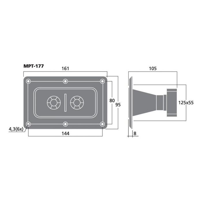 Impedance (Z): > 1,000 Ω Transmission technology: cable Frequency range: 3,500-20,000 Hz Power rating (RMS): 60 W Peak music power output (MAX): 115 W (8 Ω system) 225 W (4 Ω sSystem) SPL: 99 dB/W/m Max. voltage: ~ 30 V Mounting cutout: 125 x 55 mm Mounting depth: 97 mm Dimensions: 161 x 95 x 105 mm Width: 161 mm Height: 95 mm Depth: 105 mm Colour: black Admiss. ambient temp.: 0-40 °C Weight: 0.14 kg Packing unit: 1 Packaging dimensions (W x H x L): 0.1 x 0.105 x 0.165 m Gross weight: 0.151 kg Net weight: 0.145 kg