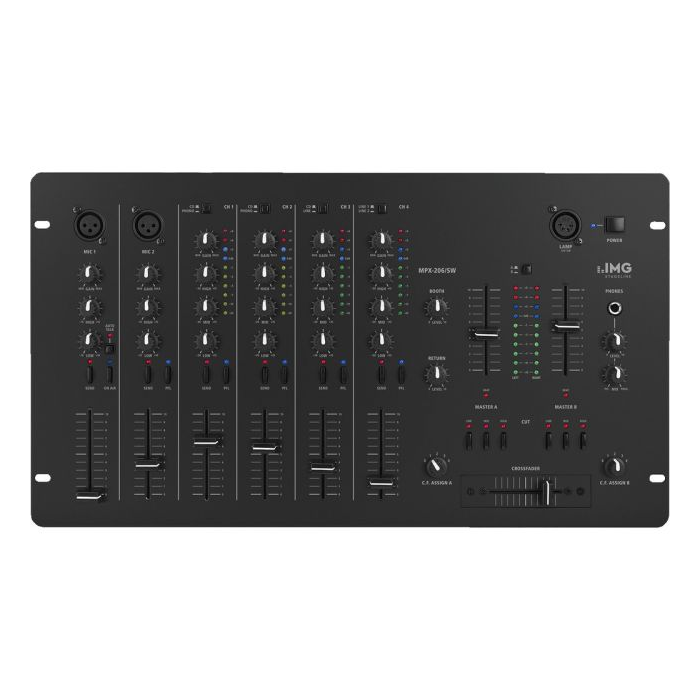 • 1 DJ mikrofónny kanál s prepínateľným automatickým talkover a 1 hosťovským mikrofónnym kanálom, oba kanály s ovládaním gain ako aj 2-pásmový ovládač zvuku