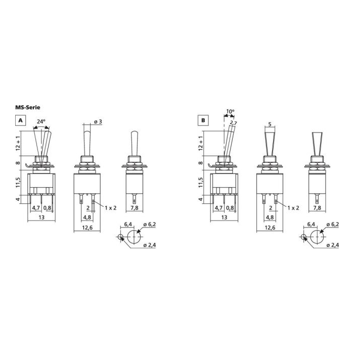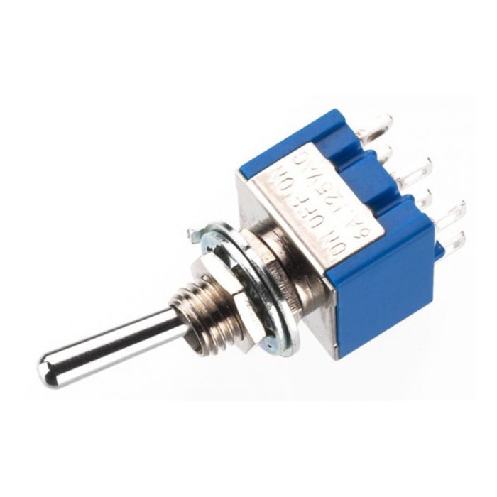 Description: toggle switch Type: standard toggle Switching function: 2 x ON/OFF/ON Hodnota výkonu: 6 A Colour/colour coding: blue, chrome Mounting hole: Ø 6 mm Dimensions: see drawing Hmotnosť: 6 g
