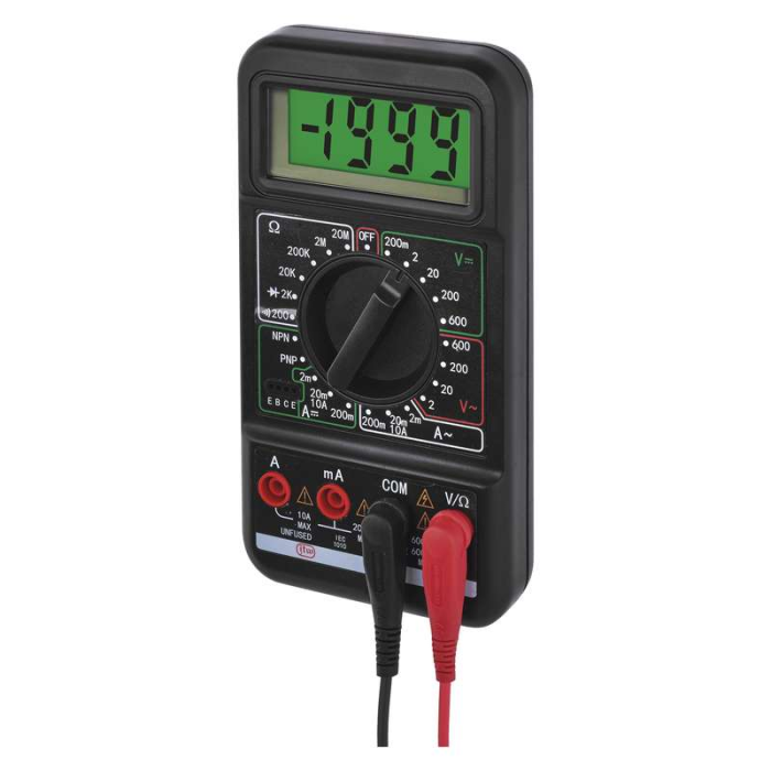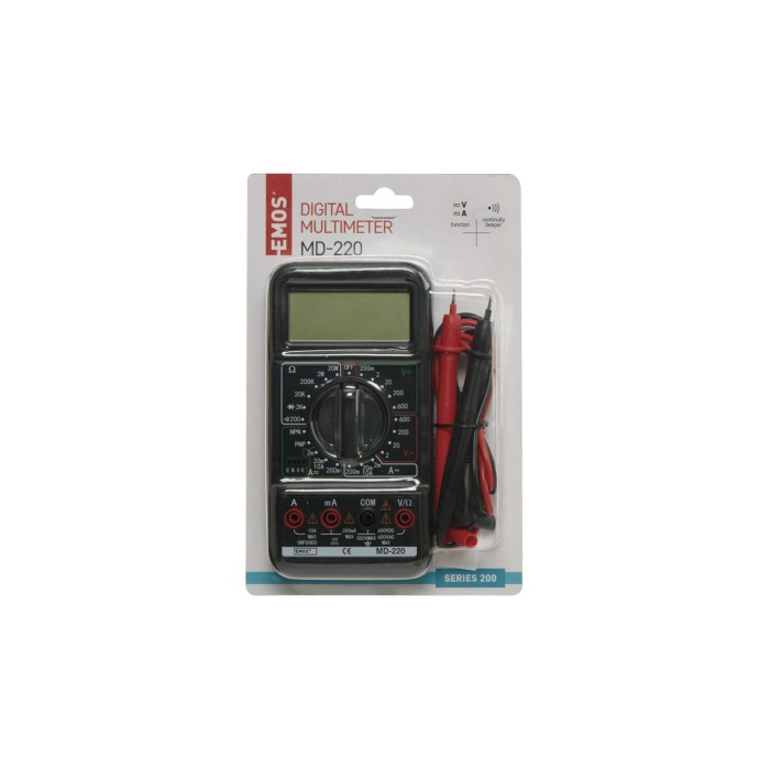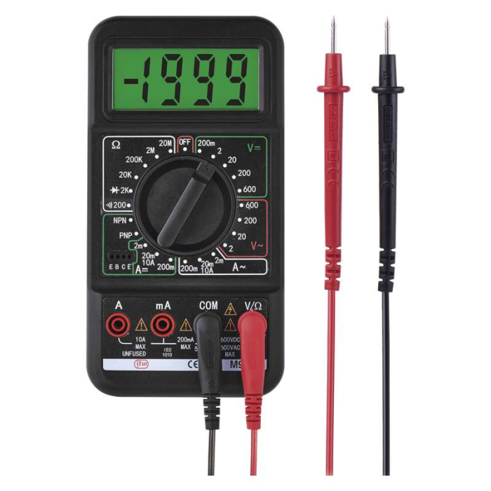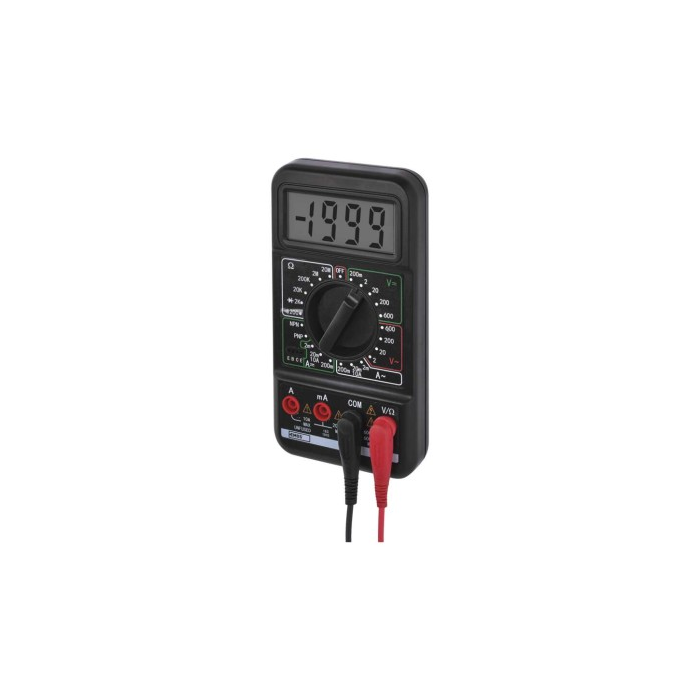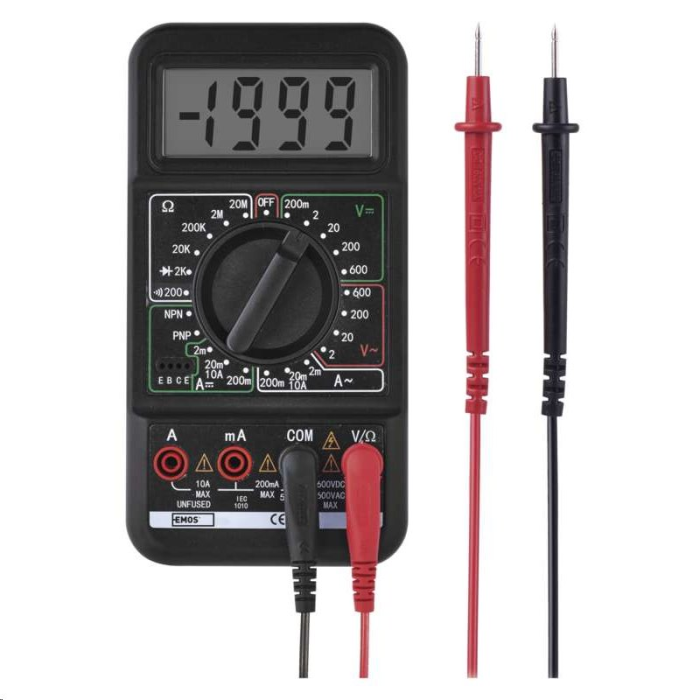 Kompaktní, bateriový, snadno ovladatelný ruční digitální přístroj pro měření střídavého a stejnosměrného proudu, napětí a elektrického odporu, pro testování diod a tranzistorů a pro zvukové zkoušky vodivosti.