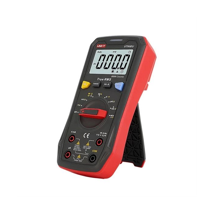 Přístroj UT60EU je digitální multimetr s rozsahem displeje 9999, který umožňuje měření skutečných efektivních hodnot RMS napětí a proudů s automatickou i manuální volbou rozsahů. Na všech rozsazích má ochrany proti přetížení 1000V rms, proudový rozsah je chráněn trubičkovou pojistkou 10A / 1000V, 6,35 x 32mm.