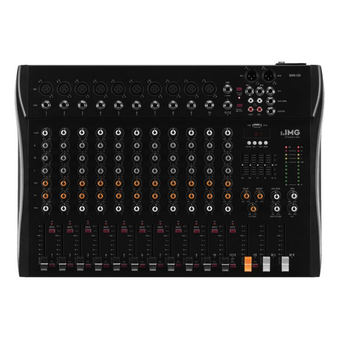 - 10 mono vstupných kanálov s reguláciou zosilnenia, 3-pásmovým ekvalizérom a pan pot