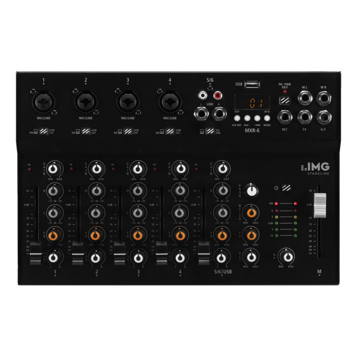 Input channels: 6 Number of mix/mono: 4 No. of stereo: 1 Mic input: 2 mV, bal. 4 x XLR Line input: 100 mV (stereo), 2 x 6.3 mm jack L/R 60 mV (mono), 2 x 6.3 mm jack Aux input: 400 mV, 1 x 6.3 mm jack L/R Master output: 500 mV, 1 x 6.3 mm jack L/R Effect send: 4.4 V, 1 x 6.3 mm jack Headphones: ≥ 8 Ω, 1 x 6.3 mm jack USB: yes Bluetooth: yes Frequency range: 20-20,000 Hz THD: < 0.03% S/N ratio: > 83 dB(A) Equalizer bass: ±15 dB/80 Hz Equalizer treble: ±15 dB/12 kHz Phantom power: +48 V Power supply: USB or encl. power supply Admiss. ambient temp.: 0-40 °C Dimensions: 308 x 53 x 205 mm Width: 308 mm Height: 53 mm Depth: 205 mm Weight: 1.9 kg Packaging dimensions (W x H x L): 0.33 x 0.24 x 0.08 m Gross weight: 2.1 kg Net weight: 1.93 kg