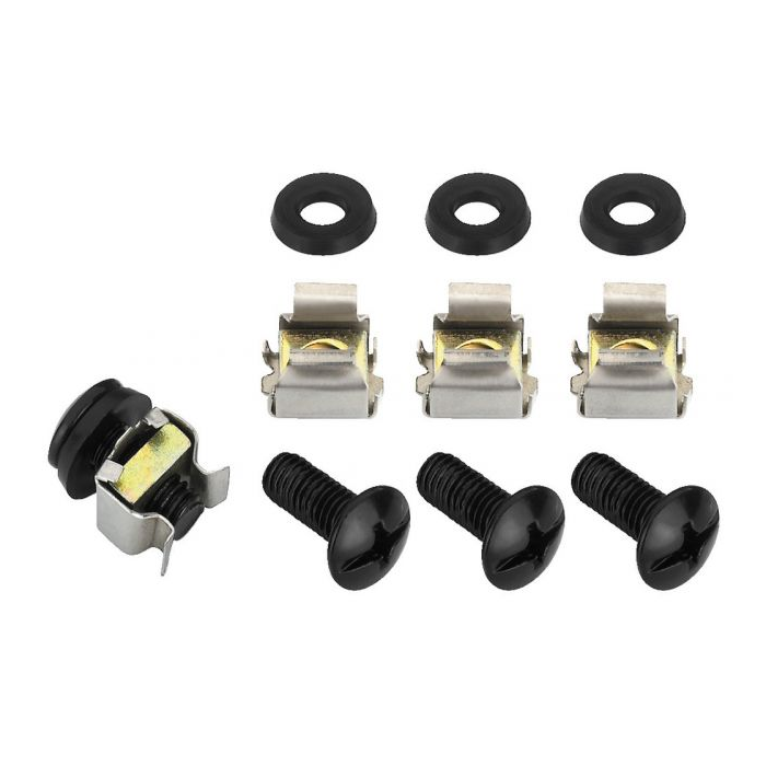 Description: set of cage nuts and screws Type: 4 x M6 cage nut, 4 x M6 x 15 mm recessed head screw, 4 x plastic washer Suitable for: 482 mm (19") inserts Admiss. ambient temp.: 0-40 °C Weight: 30 g Packing unit: 4 Packaging dimensions (W x H x L): 0.095 x 0.015 x 0.11 m Gross weight: 0.034 kg Net weight: 0.03 kg