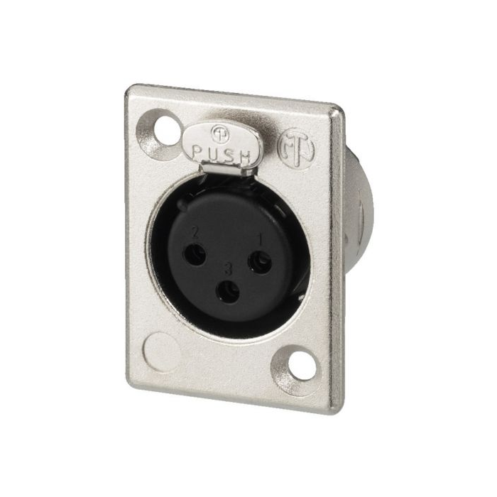 Description: panel jack Type: NEUTRIK XLR Quantity: 1 Features: nickel-plated contacts, solder lugs Colour/colour coding: silver Pole number: 3 Connection: 3-pole XLR jack Material: metal Admiss. ambient temp.: -30 °C to +80 °C Weight: 24 g Other features: P series
