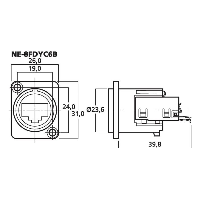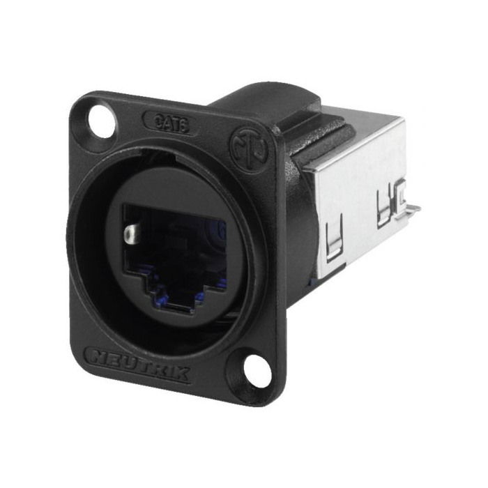 Description: panel jack Type: NEUTRIK EtherCon Quantity: 1 Features: insulation displacement contacts (IDC), selectable grounding option, Cat. 6 Colour/colour coding: black Connection: RJ45 jack Admiss. ambient temp.: -10 °C to +60 °C Dimensions: 26 x 31 x 39.8 Weight: 31 g Other features: D series