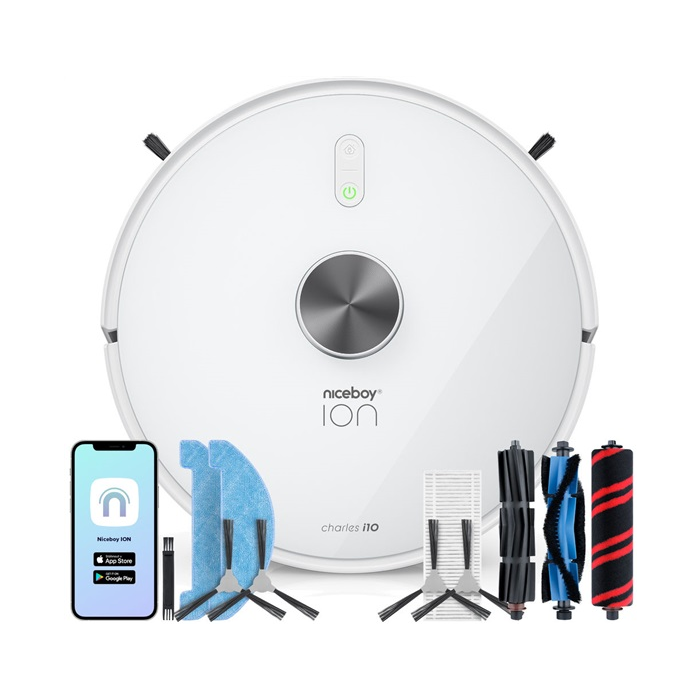 Niceboy ION Charles i10 je 3v1 robotický vysavač s vysáváním, mopováním, UV-C sterilizací, LiDAR mapováním pro úplné pokrytí, ovládáním přes aplikaci, silným motorem 3500 Pa a HEPA H13 filtrem pro precizní úklid.