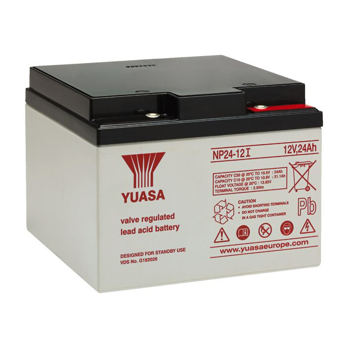 Rated voltage: 12 V Capacity: 24 Ah Technology: lead-acid Quantity: 1 Charging voltage: at 20 °C:13.65 V (normal)14.5 V (boost charge) Charging current: with boost charge: 6 A max. VdS No.: G182026 Dimensions: 175 x 125 x 166 mm Weight: 9 kg Connections: threaded bushing M5 Other features: BPB, VRLA, VdS