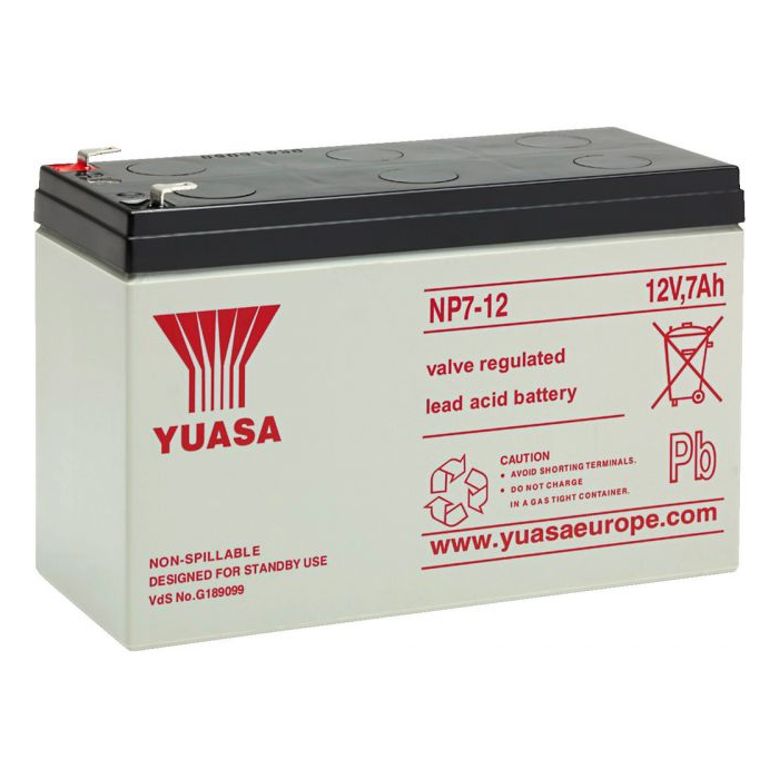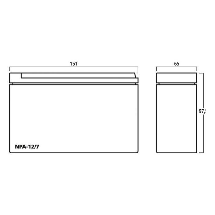 Rated voltage: 12 V Capacity: 7.0 Ah Technology: lead-acid Quantity: 1 VdS No.: yes Dimensions: 151 x 97.5 x 65 mm Weight: 2.4 kg Connections: push-on terminal 4.8 mm(Faston 187) Other features: SBPO, CO