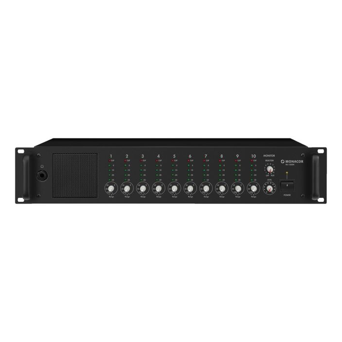 Power rating: 2 W Channels: 11 Inputs: 1-100 V/10 kΩ (monitor)0.775 V/600 Ω (aux) Frequency range: 100-20,000 Hz THD: < 0.3% Power supply: ˜ 230 V/50 Hz/15 VA, DC 24 V/0.5 A Mains voltage: DC 230 V Mains frequency: 50 Hz Power consumption, operation: 15 VA Operating voltage (possible alternative): DC 24 V Power supply (possible alternative): 0.5 A Admiss. ambient temp.: 0-40 °C Width: 482 mm Height: 88 mm Depth: 200 mm Rack units, RU: 2 Weight: 4.7 kg Connections: screw terminals (monitor input 1-10), screw terminals (aux input), 6.3 mm jack (headphones) Packaging dimensions (W x H x L): 0.34 x 0.175 x 0.55 m Gross weight: 5.86 kg Net weight: 4.8 kg