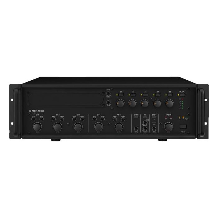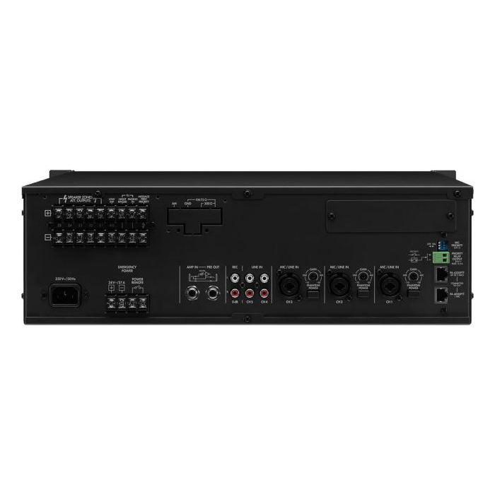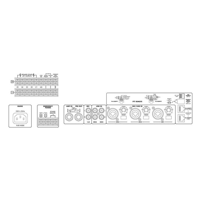 Connections: 3 x combo 6.3 mm/XLR (mic/line inputs), 2 x RCA L/R (line inputs), 2 x RJ45 (push-to-talk microphone), screw contacts (telephone system), 1 x 6.3 mm jack (preamplifier), 1 x 6.3 mm jack (ext. amplifier), 1 x RCA L/R (record), screw contacts (speakers)