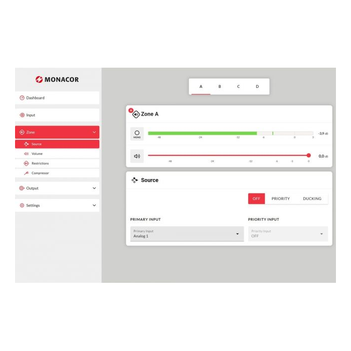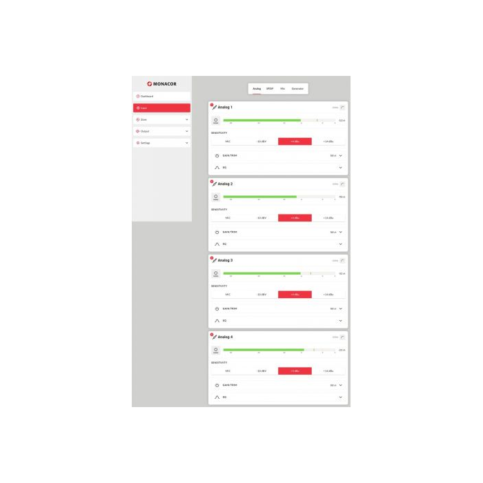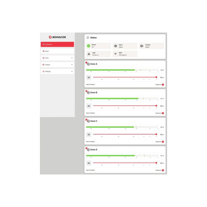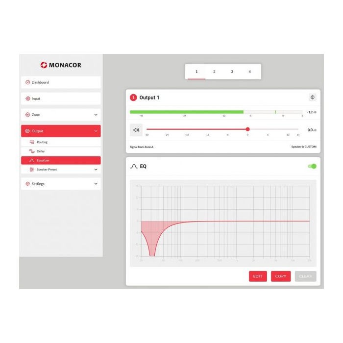 - Výkon a flexibilita: 4 x 125W na zónu (4/8 Ω) alebo 2 x 250W (100V) - prevádzka 100V alebo 4/8 Ω