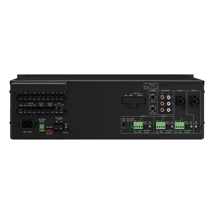 Connections: 1 x 6.3 mm jack (mic), 2 x combo 6.3 mm/XLR (mic/line), 3 x RCA L/R (line), 3 x plug-in terminals (line), 1 x 6.3 mm jack (preamplifier input), screw contacts (push-to-talk mic), screw contacts (zone paging mic), 1 x 6.3 mm jack (preamplifier output), screw contacts (chime button), screw contacts (speakers)