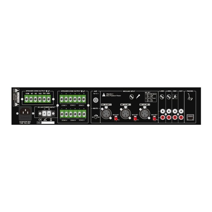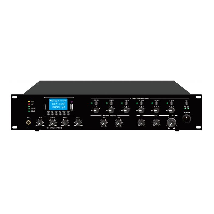 6 zńový mixážny zosilňovač s MP3/USB/FM tunerom/Bluetooth, 240 W, je ideálny pre vyhlasovanie a prehrávanie podmazovej hudby v školách, super marketoch, bankách a hoteloch. All in one riešenie s 6 vstupovým mixom a výkonovým zosilňovačom v jednej 19“ jednotke s výškou 2U. 1 mikrofónový vstup (6,3mm jack), 3 mono vstupy prepínateľné mikrofon/linka (XLR), 2 linkové stereo vstupy, jeden EMC vstup a jeden RJ45 vstup pre 6 zónový diaľkový vyhlasovací mikrofón. Prehrávač s USB a SD slotom na prednej strane. Zosilňovač je navrhnutý s kompletnou ochranou proti preťaženiu, skratu a vysokej teplote, aby sa zabránilo akémukoľvek poškodeniu.