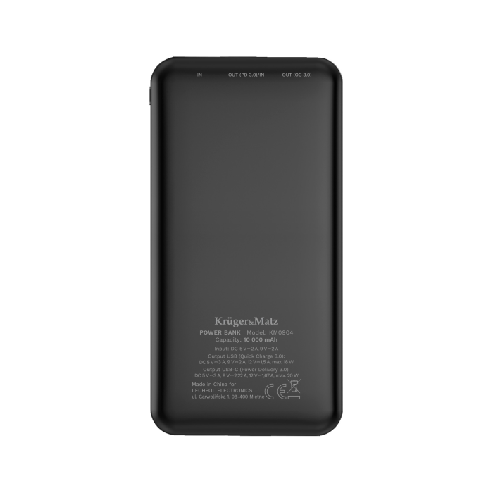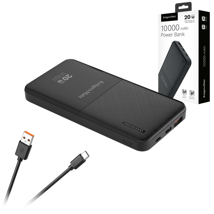 KRUGER & MATZ KM0904 Powerbanka s kapacitou 10000mAh, funkcí rychlého nabíjení pomocí technologie Quick Charge nebo Power Delivery. Lze nabíjet 2 zařízení současně.