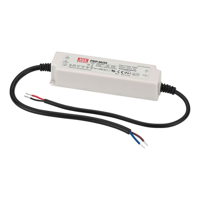 Category: LED switch-mode power supply Input voltage: ˜ 100-240 V/50 Hz/60 Hz Output voltage: DC 24 V Output current: 2.5 A Connections: open cable ends Short-circuit protection: yes Overload protection: yes Overheat protection: yes Protective class: IP67 Admiss. ambient temp.: -20-+50 °C Dimensions: 200 x 41 x 32 mm Weight: 413 g Position: B
