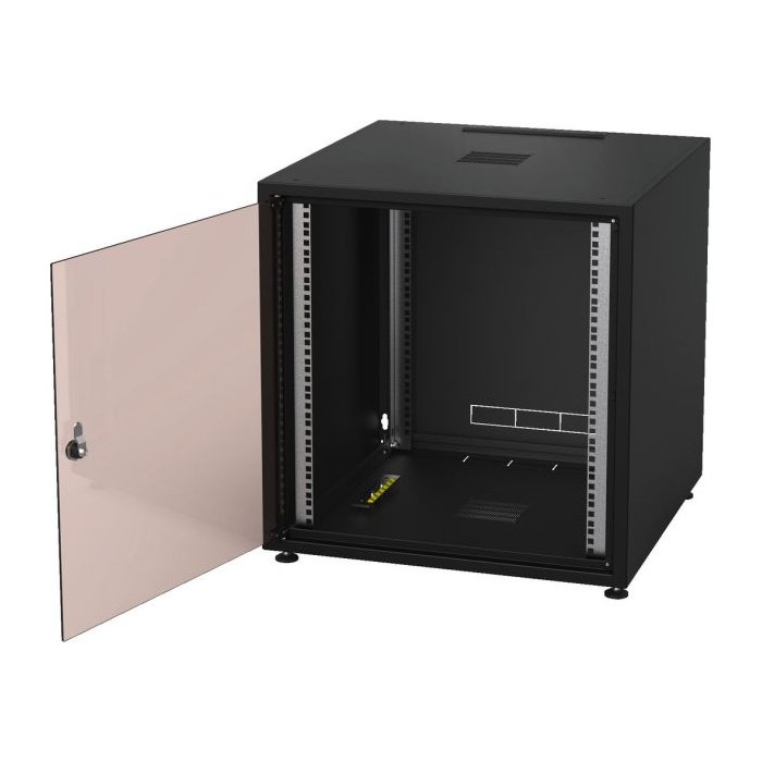 Intended use/capacity: studio rack Size: 482 mm (19") Rack units, RU: 12 Colour: black Version: cabinet body with door, removable rear panel Material: sheet steel,protective glass (door) Castors: 4 levelling feet Protective class: IP20 acc. to EN 60529 Usable depth: 533 mm Outside dimensions: 600 x 604 x 600 mm Width: 600 mm Height: 604 mm Depth: 600 mm Max. load capacity: 30 kg Weight: 24.82 kg