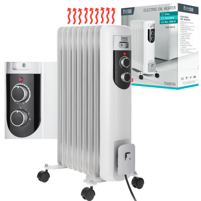 Elektrický olejový radiátor, 9 topných článků, max. příkon 2000 W, nastavitelný termostat, ochrana proti přehřátí, bezúdržbový provoz, automatické vypnutí při převrhnutí přístroje