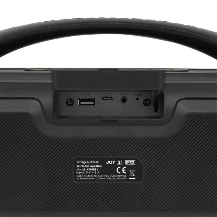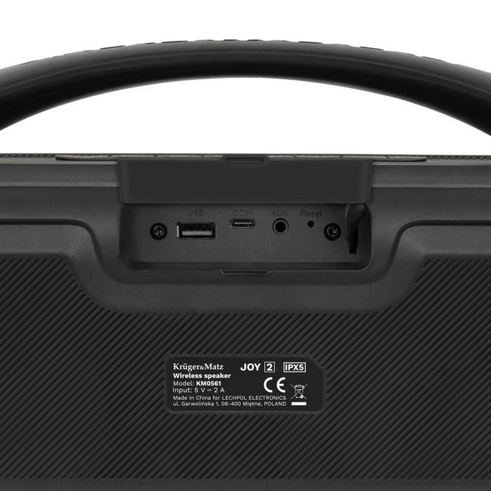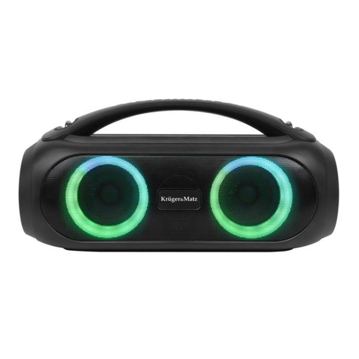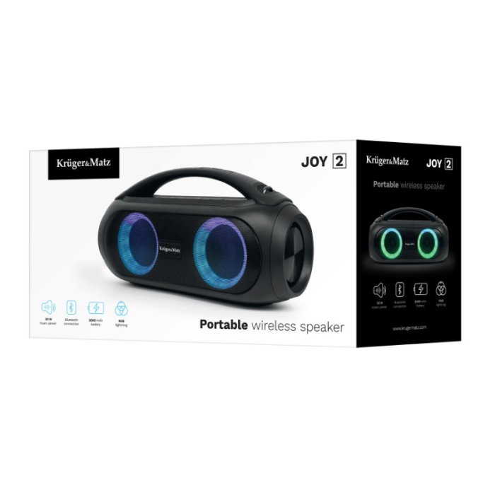 Reproduktor Bluetooth Kruger&Matz Joy 2 je vybaven 2 středotónovými měniči a 1,5palcovým výškovým reproduktorem s celkovým výkonem 20 W. V případě potřeby můžete reproduktor doplnit o další reproduktory. Kromě toho je tento model vybaven dvěma pasivními membránami pro zvýraznění zvuku basových tónů.