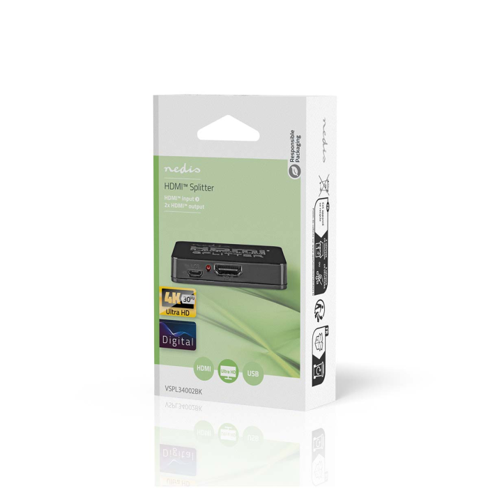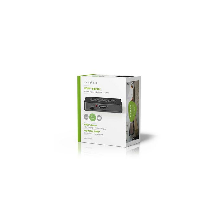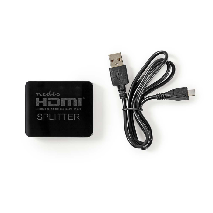 NEDIS VSPL34002BK HDMI rozbočovač 1›2 – kompaktní aktivní splitter pro rozdělení HDMI signálu z jednoho zdroje na dva displeje. Podpora 4K@30Hz, 3D, prostorového zvuku a napájení přes USB.