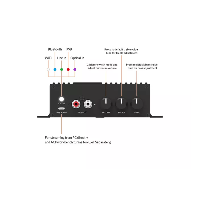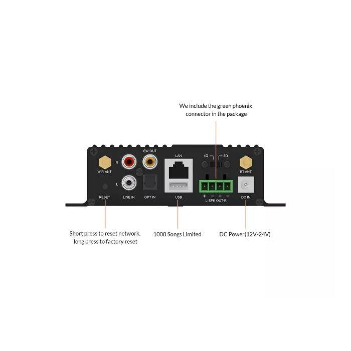 Prepínač 4/8Ω pre optimálny výkon s rôznymi reproduktormi 2-pásmový ekvalizér pre prispôsobenie zvuku vašim preferenciám Jednoduché nastavenie a konfigurácia cez mobilnú aplikáciu Podpora prehrávania z USB zariadení (až 1000 skladieb)Momentálne tu nie sú žiadne hodnotenia.