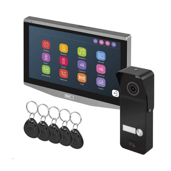 Chytrá sada domácího videotelefonu EMOS IP-750A s Wi-Fi. Dotykový displej umožňuje obousměrnou komunikaci, široké pozorovací úhly, zasílá upozornění na mobilní zařízení prostřednictvím aplikace.