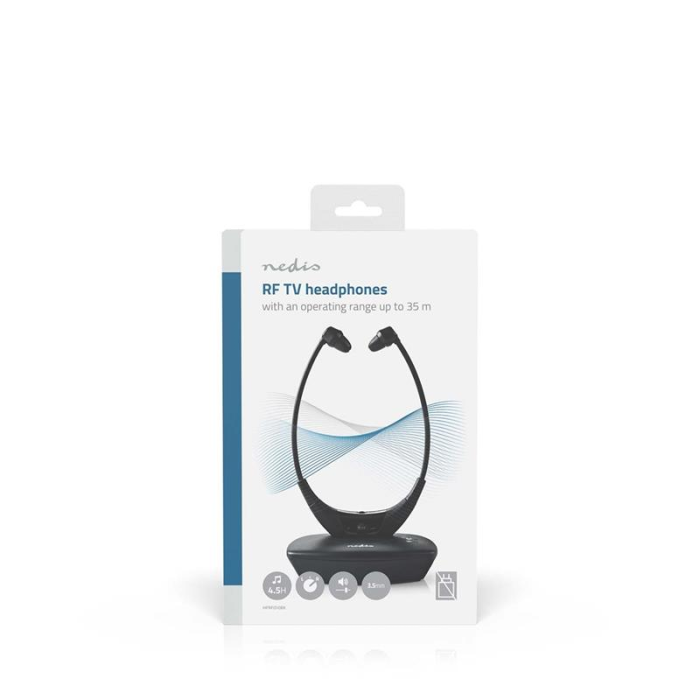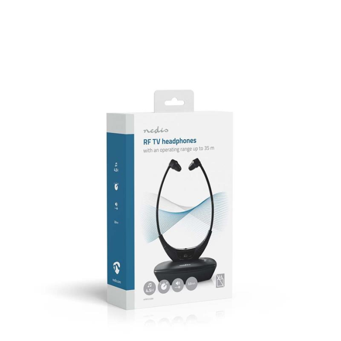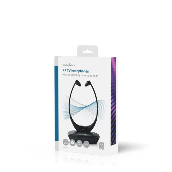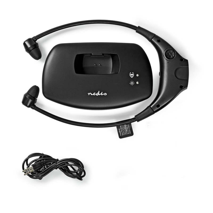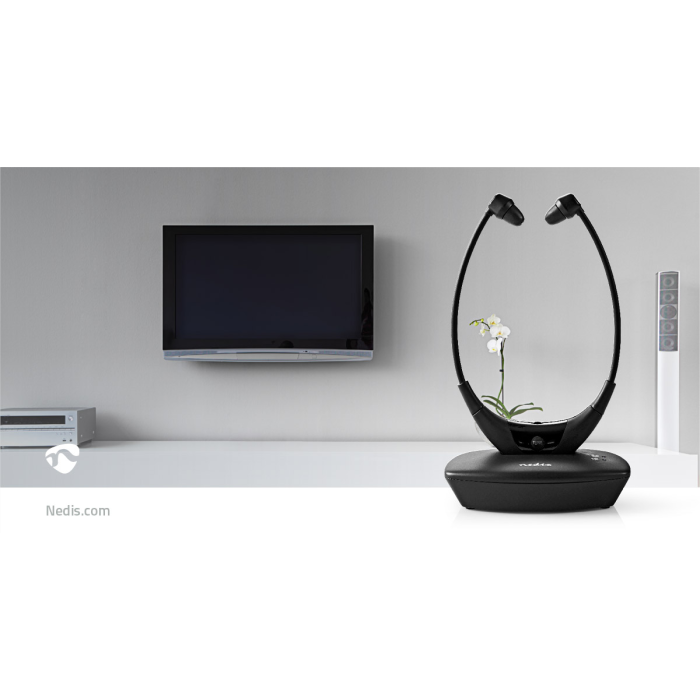 Nedis® RF bezdrátové sluchátka do uší k televizoru s nabíjecí základnou umožní sledovat televizi v dokonalém pohodlí, aniž byste rušili kohokoliv dalšího v místnosti.