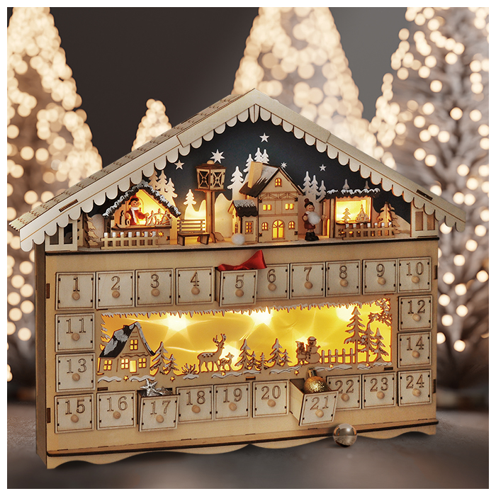 LED adventný kalendár v tvare horskej chaty pre čarovnú vianočnú atmosféru
