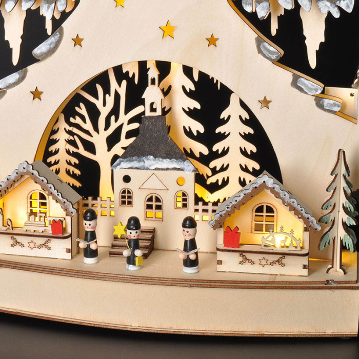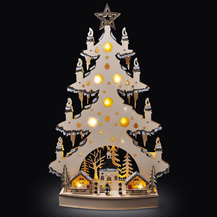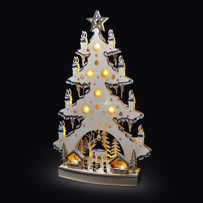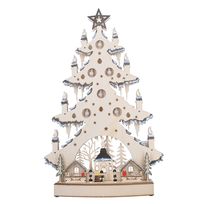 Tento drevený vianočný stromček s dekoráciami a jemným LED osvetlením je ideálnou voľbou na vytvorenie sviatočnej nálady v každom interiéri. Vďaka prírodnému vzhľadu dreva a detailne prepracovaným dekoráciám sa stane štýlovým doplnkom vášho domova, kancelárie alebo napríklad detskej izby. Teplé biele svetlo 23 LED diód navodí príjemnú atmosféru a podčiarkne čaro vianočných sviatkov, či už stromček postavíte na stôl, komodu alebo parapet.