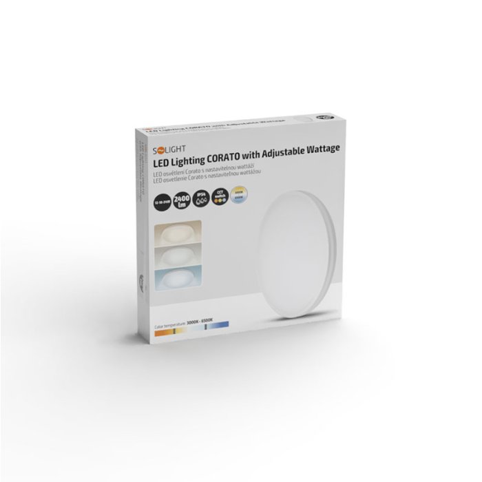 Corato ponúka špeciálny prepínač, ktorým možno jednoducho voliť teplotu chromatickosti medzi teplou, neutrálnou a studenou bielou (3000 K, 4000 K alebo 6500 K), takže si svetlo prispôsobíte aktuálnej nálade alebo potrebám priestoru. Ďalší prepínač umožňuje nastaviť príkon v rozmedzí 12-18-24 W, čo ovplyvňuje intenzitu svetelného toku až do hodnoty 2400 lm. Vďaka širokému uhlu svietenia 120° a vysokému indexu podania farieb Ra >80 poskytuje Corato príjemné a rovnomerné osvetlenie. Dlhá životnosť LED až 25 000 hodín a prevádzková teplota od -20 °C do 50 °C zaručujú dlhodobú spoľahlivosť a nízke nároky na údržbu.