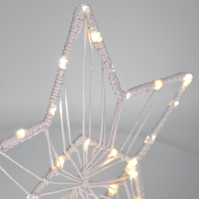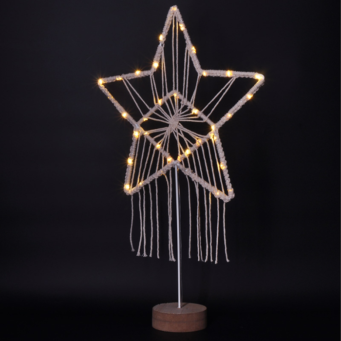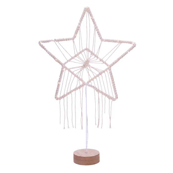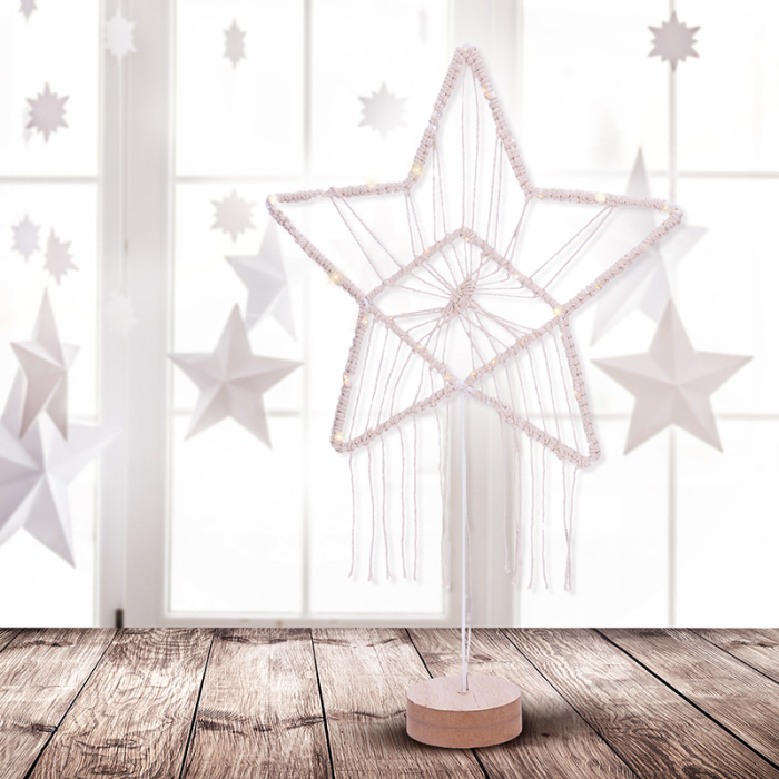 Pletená vianočná hviezda so stojanom a reťazou s LED diódami je štýlovým doplnkom, ktorý vnesie do vášho domova čarovnú atmosféru Vianoc. Vďaka kombinácii kovu, dreva a textilu pôsobí hviezda elegantne a zároveň útulne, takže sa skvele hodí do moderných aj tradičných interiérov. Teplé biele svetlo 35 LED diód jemne presvetľuje štruktúru hviezdy a vytvára príjemné svetelné efekty, ktoré podčiarknu slávnostnú náladu v každej miestnosti.