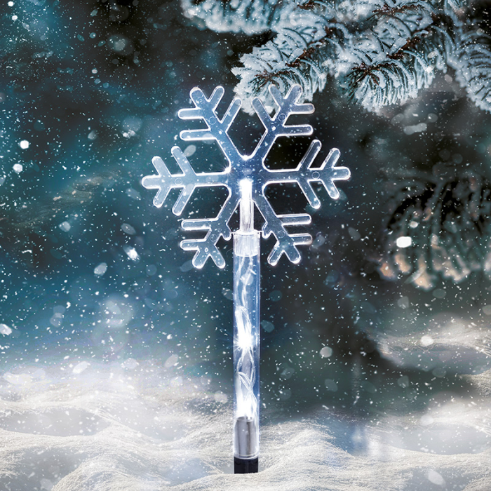 Ozdobte svoju záhradu alebo vonkajší priestor originálnymi LED zapichovacími svetelnými vločkami, ktoré vyniknú najmä počas zimných mesiacov a vianočných sviatkov. Sada obsahuje 5 transparentných vločiek s celkovo 15 LED diódami, ktoré svietia príjemným studeným bielym svetlom. Vďaka výške 35 cm a celkovej dĺžke 140 cm (plus 50 cm napájací kábel) ľahko vytvoríte pôsobivú svetelnú dekoráciu pozdĺž chodníkov, záhonov alebo na trávniku. Svetelné vločky sú vyrobené z odolného plastu a vďaka stupňu krytia IP44 sú vhodné na vonkajšie použitie aj za nepriaznivého počasia.