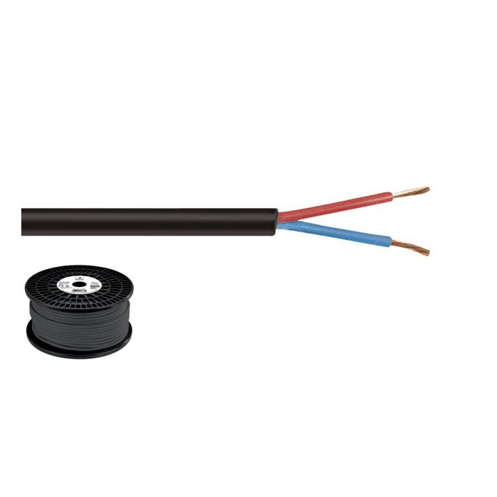 Intended use: speakers, stage, 100 V PA Length: 100 m Colour: black Internal conductor: 2 x 1.5 mm2 Material: OFC No. of cores: 2 Cable diameter: Ø 7.4 mm Metre marking: yes Packaging: reel Weight: 8.55 kg