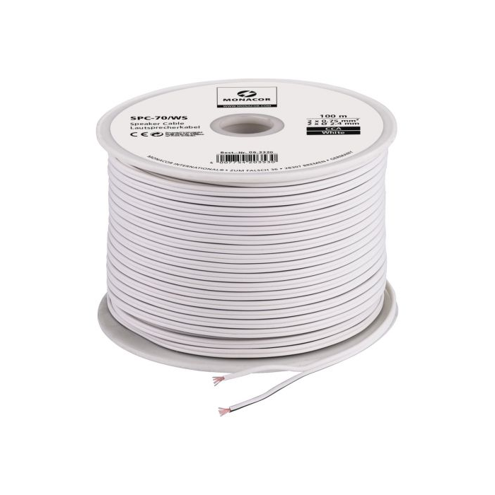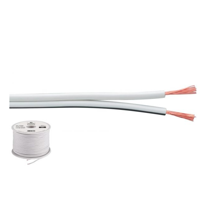 Intended use: speakers Length: 100 mm Colour: white Internal conductor: 2 x 0.75 mm2 Material: CCA No. of cores: 2 Cable diameter: 2 x Ø 2.4 mm Packaging: reel Weight: 1.8 kg Other features: core coding