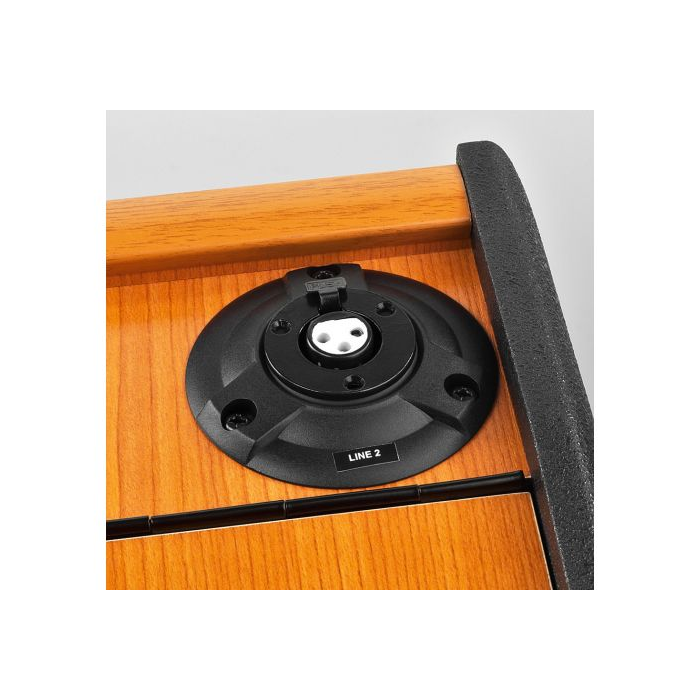 - 2 nárazy absorbujúce XLR samice vo vrchnej časti pultu pre 2 mikrofóny na husom krku (použite na každý mikrofónny vstup) alebo jeden mikrofón a jedna LED lampa na husom krku, dostupné v ponuke