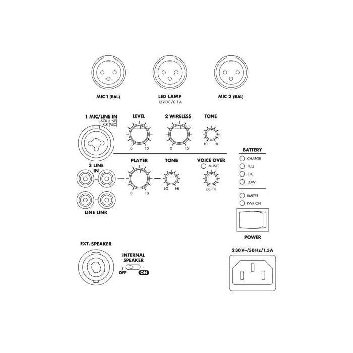 Connections: 1 x XLR (mic 1) 1 x 6.3 mm jack (line), 2 x XLR (mic 2-3), 1 x RCA L/R (aux), 1 x RCA L/R (line out), 1 x NEUTRIK SPEAKON (ext. speakers)