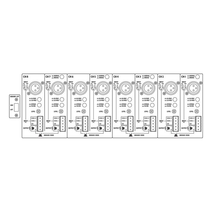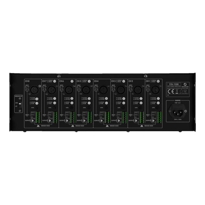 STA-1508 = 8 kanálov,"Presents itself as a power unit during monitor operation at stage performances in a club. The multi-channel concept of these amplifiers works out perfectly."